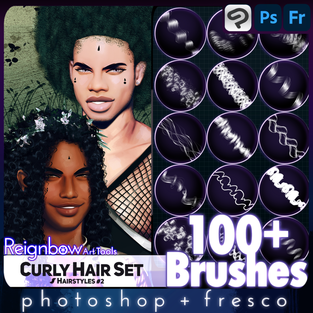 The Curly Hair Collection to "Hair Styles #2" by Reignebo Art - Premium Collection of curly hair for Adobe Photoshop, Fresco or Clip Studio Paint! This set contains 100+ brushes including outlines and multiple types of shading / highlights to suit different drawing styles. Enjoy customizing and creating different curly hair styles with this pack!