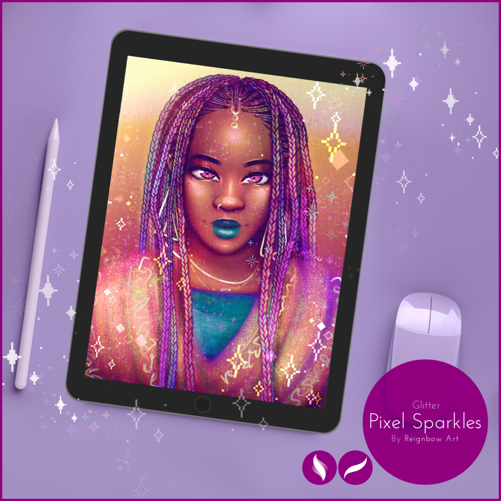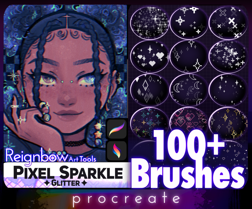 Introducing the glitter brush pack by Reignbow Art for Procreate! This set contains 100+ brushes that includes high quality retro based, cute glitter graphic / sparkles which have been created in 5k to use in any type of digital art! This pack includes large sized brushes as well as standard pixel art sized brushes to instantly create glitter and sparkles with ease! Use this to add a unique touch of glitter as makeup, comic bokeh sparkles, character design, decorations and more!