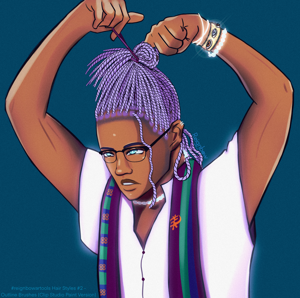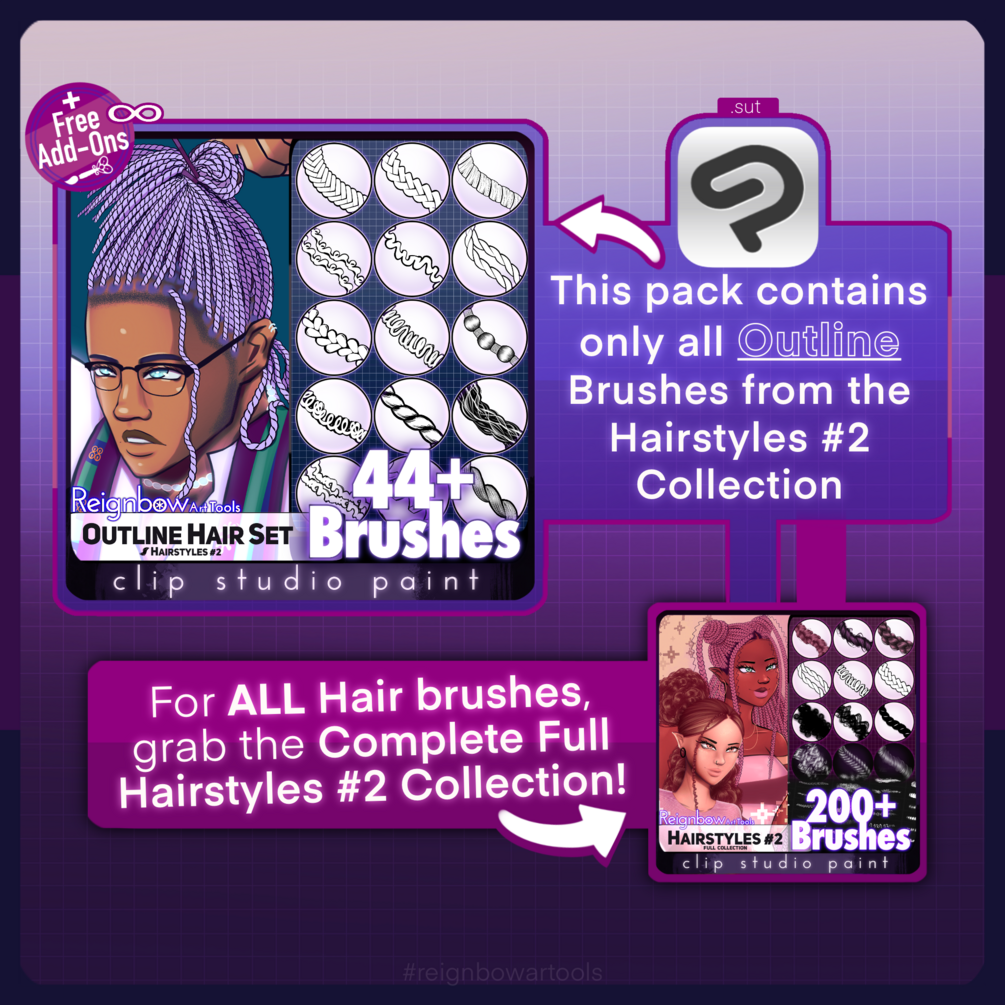 The Outline brush set from the Hair Styles #2 Collection by Reignbow Art ~ A premium super amazing outline or line art hair drawing collection for Clip Studio Paint! This set contains 44+ brushes that includes multiple hairstyles for quick and easy hair drawing in your digital manga, comics, cartoons, illustrations, anime drawings and more! Enjoy customizing and creating all types of different hair styles and textures with curls, braids, locs, natural hair and more with this bundle!