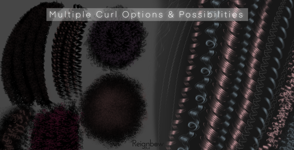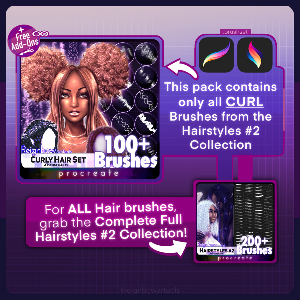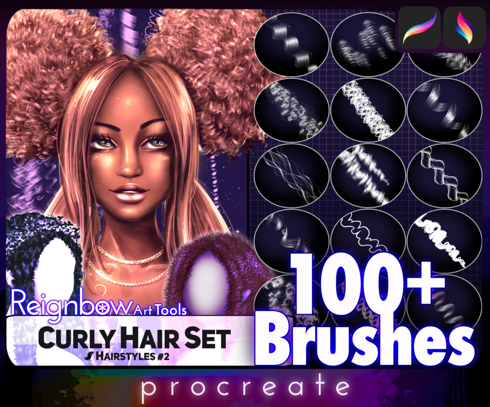 The Curly Hair Collection to "Hair Styles #2" by Reignebo Art - Premium Collection of curly hair for Procreate! This set contains 100+ brushes that includes outlines and multiple types of shading / highlights to suit different drawing styles. Enjoy customizing and creating different curly hair styles with this pack!