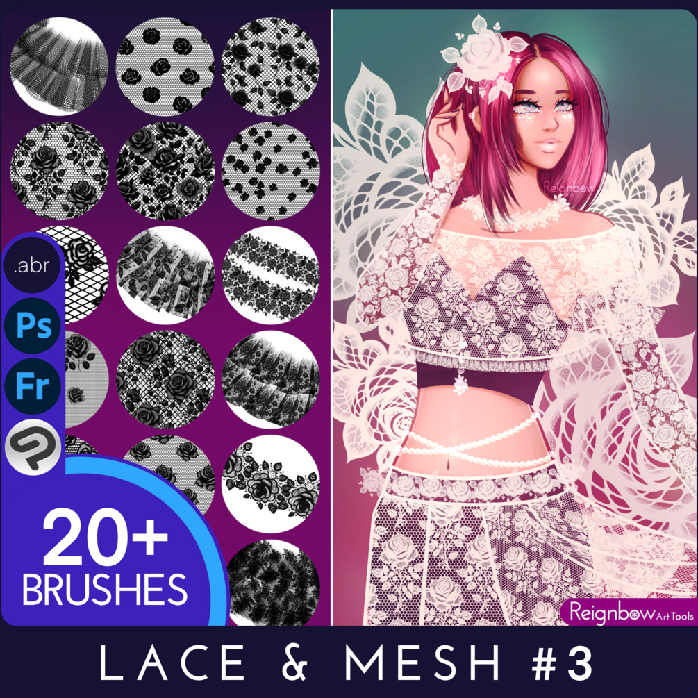 Lace & Mesh #3 Brushes - A beautiful set of 20+ cute rose-based lace brushes for Adobe Photoshop, Fresco, Clip Studio Paint or other Abr file compatible applications! Featuring Fishnets, Improved Tulle with Tutu, Mesh, Lace in all flower, rosy florals!